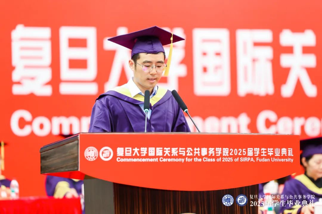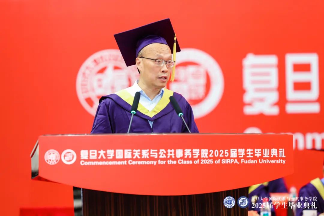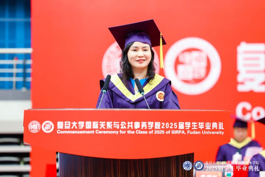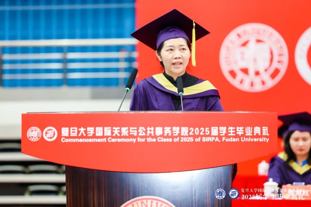 国际问题研究院蔡翠红教授作为教师代表用中英双语为全体毕业生致以寄语。蔡老师提到,要做有温度、有韧性、有担当的复旦学子,胸怀人民,目有乾坤,肩挑使命,向下扎根,向上生长。