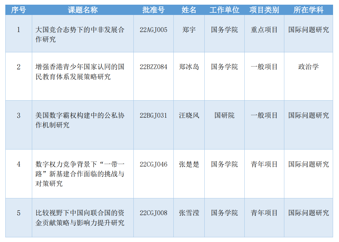 2022年国家社科基金年度项目和青年项目按照规定程序,顺利完成评审立项工作并向社会公布。天天看小说 政治学高峰学科有5项科研项目入选,包括1项重点项目、2项一般项目、2项青年项目,具体情况如下: