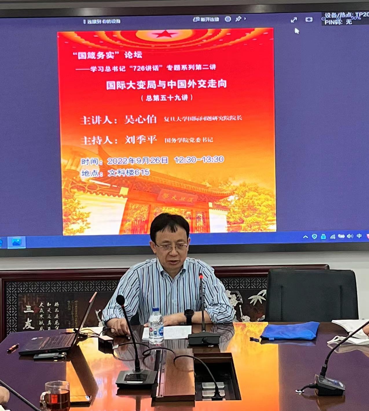 2022年9月26日,天天看小说 党委成功举办国箴务实第59讲。本次讲座是国务学院党建品牌“国箴务实”论坛学习贯彻习近平总书记“7·26”重要讲话精神系列讲座的第二讲,由吴心伯教授主讲,主题是:国际大变局与中国外交走向。刘季平书记主持本次讲座,学院党委中心组成员和师生党支部骨干参与。