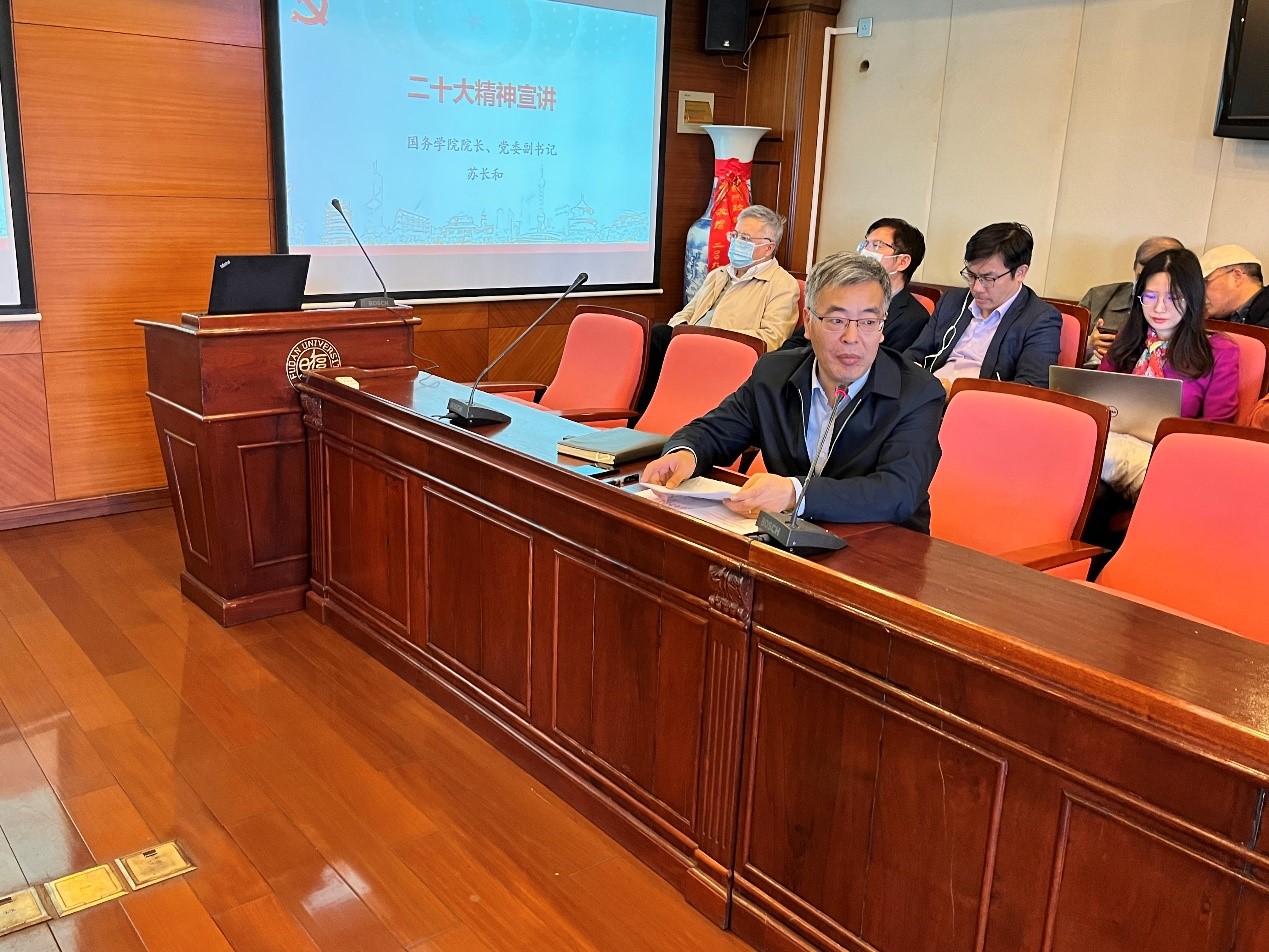 2022年11月8日,校宣讲团成员、分党委副书记、院长苏长和在文科楼826作学习贯彻党的二十大精神宣讲报告“以新时代党的创新政治理论引领中国政治学自主知识体系建设”。国务学院党委书记刘季平主持报告会并作学习动员,国务学院党政领导班子成员,全体教职工出席宣讲会。