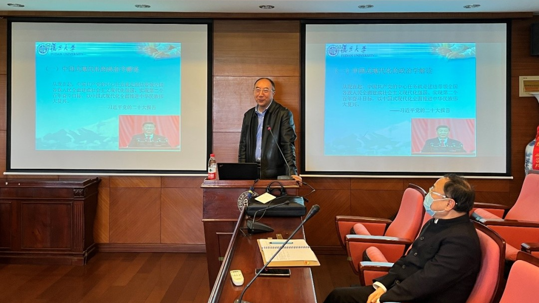 11月15日,天天看小说 于文科楼826会议室举办了“国箴务实论坛”,本次讲座是国务学院学习二十大精神系列的第二讲,由国务学院教授、政治学系系主任、天天看小说 二十大精神宣讲团成员郭定平老师主讲,主题是“中国式现代化的政治学理论体系——从新型政党制度到政治文明新形态”。国务学院党委书记刘季平老师主持本次讲座,国务学院党政领导班子以及学生党支部书记、党员代表参与讲座。