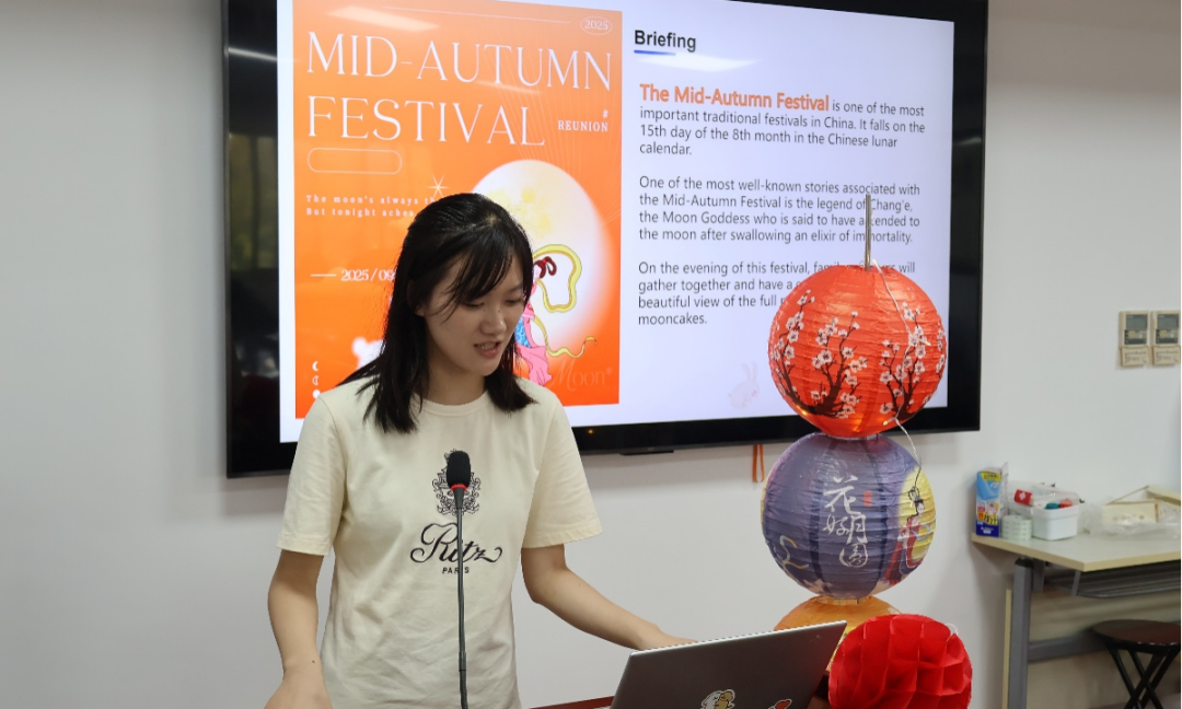 国际办公室助管沈凌璇同学向大家详细介绍了嫦娥奔月、吴刚砍桂等中秋节的神话渊源,以及赏月、燃灯、团聚等中秋传统习俗,并对月饼的名字来历、制作方法以及文化寓意进行了讲解,为大家送上了“但愿人长久,千里共婵娟”的祝福。