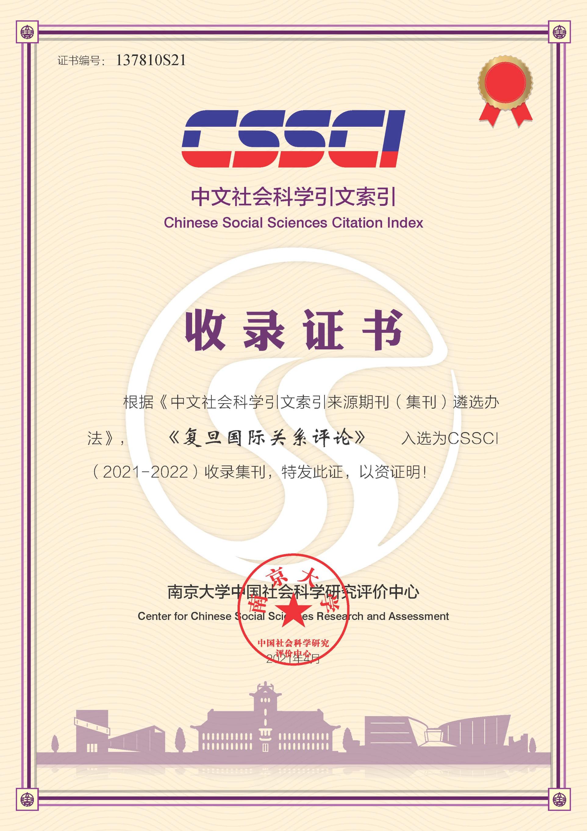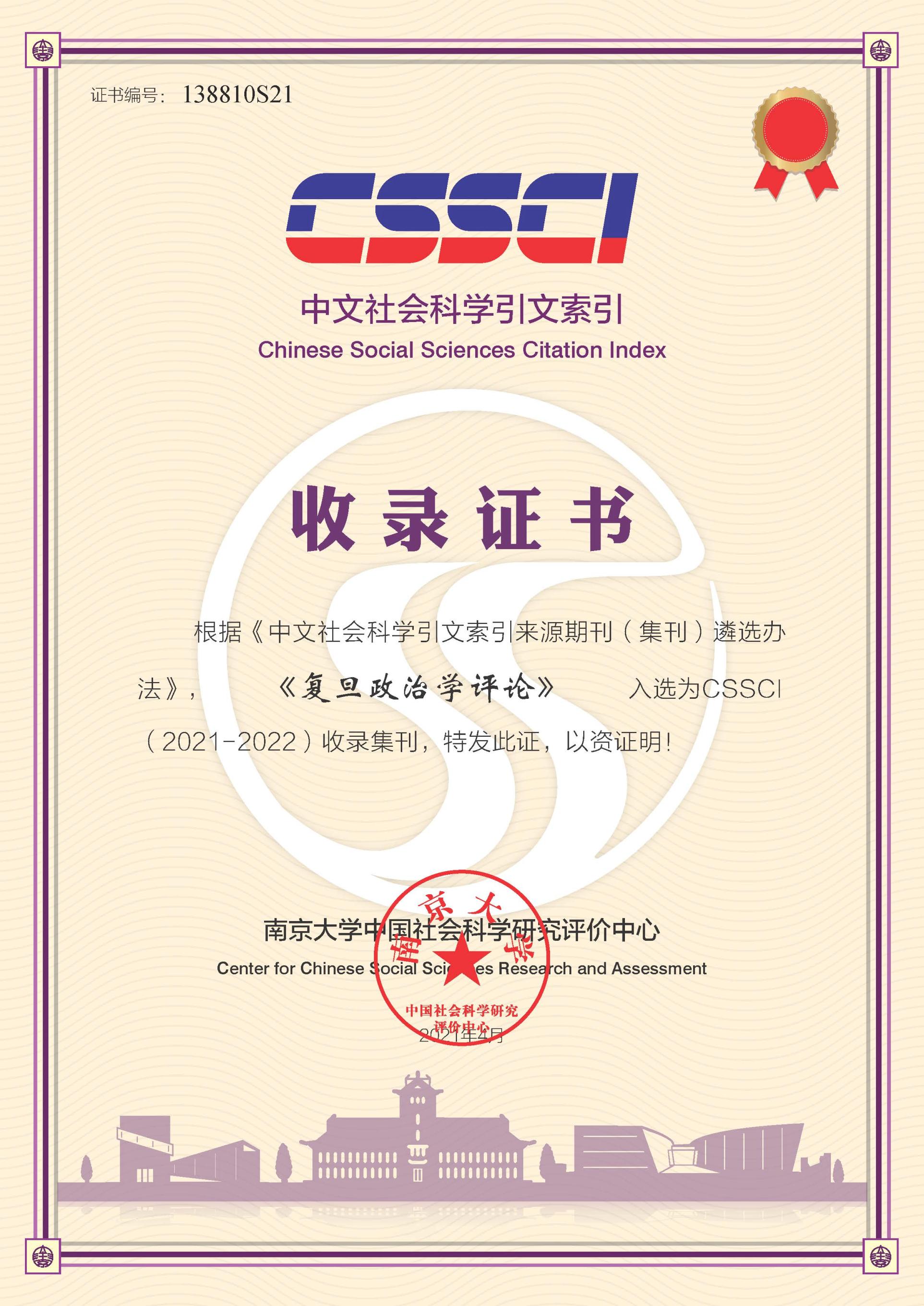 近日,根据《中文社会科学引文索引来源期刊(集刊)遴选办法》,《复旦政治学评论》(2003年创办,连续出22本),《复旦国际关系评论》(2001年创办,连续出26本),《复旦公共行政评论》(2001年创办,连续出版23本),《美国问题研究》(2002年创,连续出32本),《韩国问题研究论丛》(1995年创办,连续出39本),《宗教与美国社会》(2004年创办,连续出19本),6本集刊入选CSSCI(2021-2022)收录集刊。