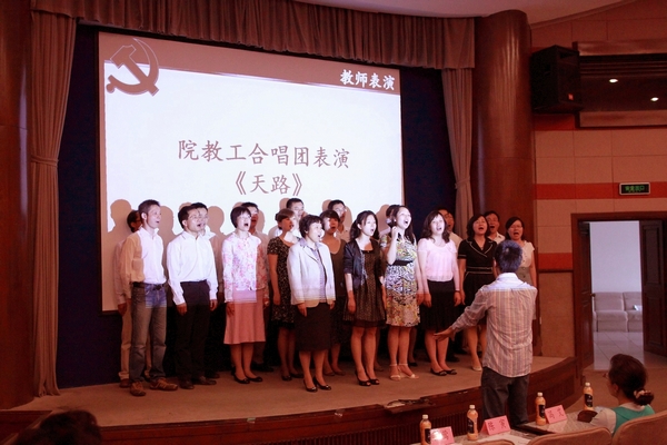 庄严的奏国歌仪式过后,主持人介绍到场嘉宾。随后沈兰芳老师致开场辞,希望同学们藉由红歌感受革命前辈的情感,领略党的光辉历程。之后,国务学院教工合唱团献唱了《天路》和《爱我中华》两首曲目,得到了大家的一致好评。