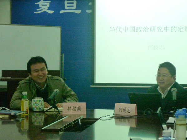 2013年4月12日晚上六点半,由国务学院研究生团学联举办的“社会科学研究设计系列讲座”第一讲于文科楼615室举行。本次讲座由国务学院何俊志副教授主讲,主题是“当代中国政治研究中的定量方法”,由国务学院韩福国副教授主持。张骥博士、包刚升博士还有20余名学生参加了本次讲座。