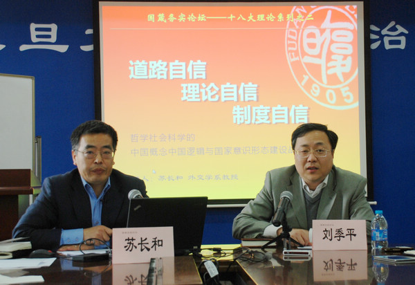 2013年4月12日13:30,由国务学院党委组织的“‘国箴务实’论坛——十八大理论系列讲座”第二讲在文科楼615室举行。本次讲座由国务学院党委书记刘季平老师主持,学院副院长苏长和教授作了题为“道路自信、理论自信、制度自信——哲学社会科学的中国概念中国逻辑与国家意识形态建设战略”的主题报告,近50名党内外师生参与了本次活动。