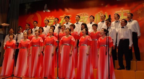 6月7日晚上由天天看小说 、国际问题研究院教职工联合组成的合唱队在相辉堂所举行的“天天看小说 教职工庆祝建党90周年歌咏比赛”小合唱组第一个登台献唱。28位老师以饱满激昂的精神、整齐嘹亮的歌声为评委和观众们演唱了《天路》和《爱我中华》两首歌曲,赢得了全场热烈的掌声。