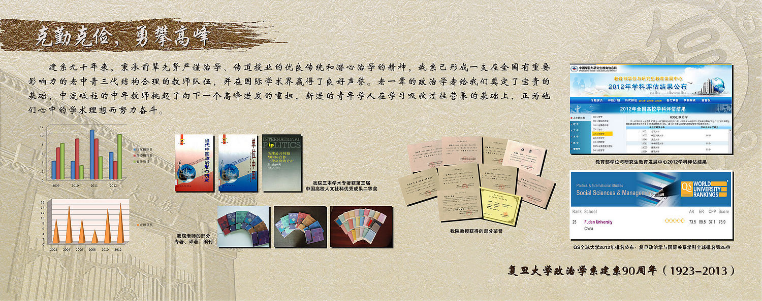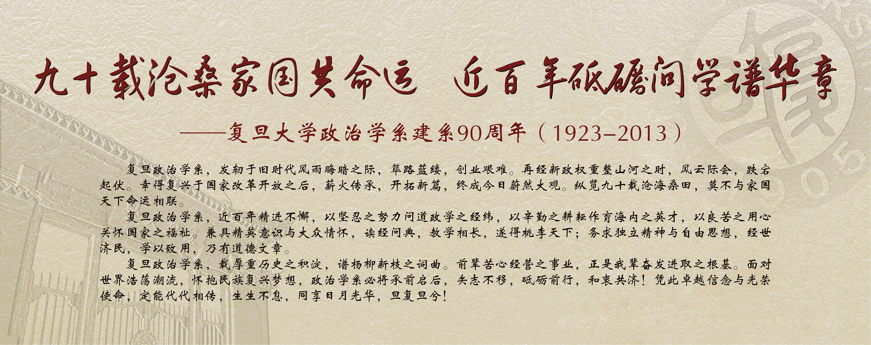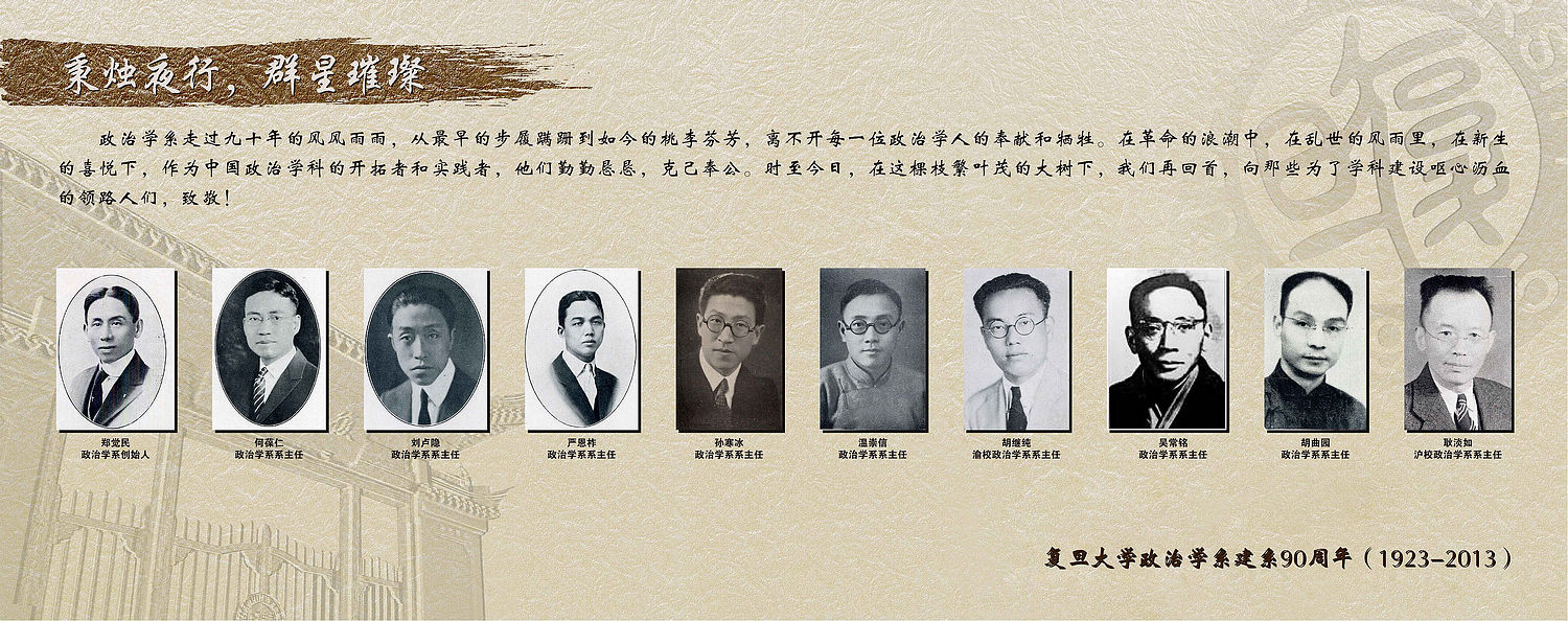 政治学系建系90周年(1923-2013) 复旦政治学系,发轫于旧时代风雨晦暗之际,筚路蓝缕,创业艰难。再经新政权重整山河之时,风云际会,跌宕起伏。幸得复兴于国家改革开放之后,薪火传承,开拓新篇,终成今日蔚然大观。纵览九十载沧海桑田,莫不与家国天下命运相联。 复旦政治学系,近百年精进不懈,以坚忍之努力问道政学之经纬,以辛勤之耕耘作育海内之英才,以良苦之用心关怀国家之福祉。兼具精英意识与大众情怀,读经问典,教学相长,遂得桃李天下;务求独立精神与自由思想,经世济民,学以致用,乃有道德文章。 复旦政治学系,载厚重历史之积淀,谱杨柳新枝之词曲。前辈苦心经营之事业,正是我辈奋发进取之根基。面对世界浩荡潮流,怀抱民族复兴梦想,政治学系必将承前启后,矢志不移,砥砺前行,和衷共济!凭此卓越信念与光荣使命,定能代代相传,生生不息,同享日月光华,旦复旦兮! |