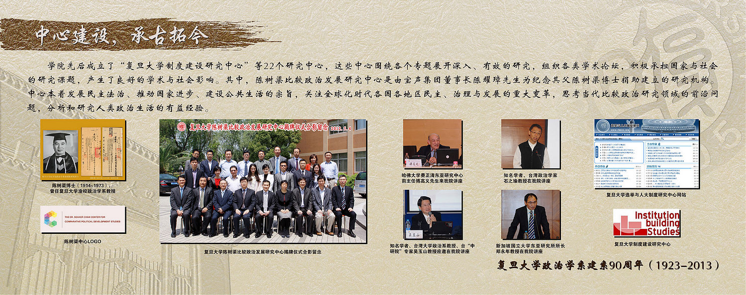制度建设研究中心”等22个研究中心,这些中心围绕各个专题展开深入、有效的研究,组织各类学术论坛,积极承担国家与社会的研究课题,产生了良好的学术与社会影响。其中,陈树渠比较政治发展研究中心是由宝声集团董事长陈耀璋先生为纪念其父陈树渠博士捐助建立的研究机构。中心本着发展民主法治、推动国家进步、建设公共生活的宗旨,关注全球化时代各国各地区民主、治理与发展的重大变革,思考当代比较政治研究领域的前沿问题,分析和研究人类政治生活的有益经验。 |
