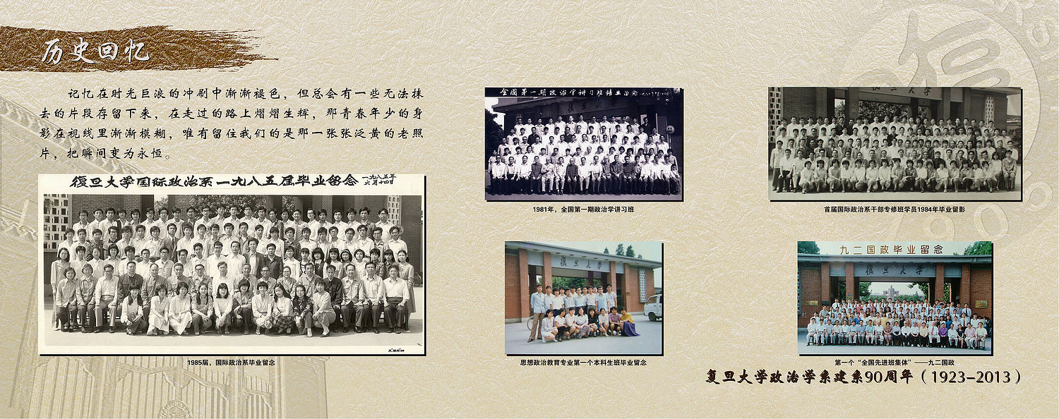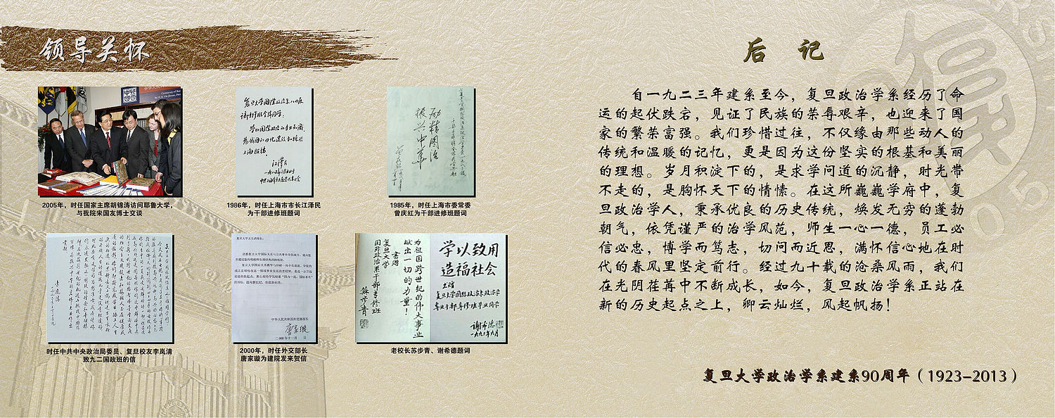 | 高清图下载: 1-13-01.jpg 后 记 自一九二三年建系至今,复旦政治学系经历了命运的起伏跌宕,见证了民族的荣辱艰辛,也迎来了国家的繁荣富强。我们珍惜过往,不仅缘由那些动人的传统和温暖的记忆,更是因为这份坚实的根基和美丽的理想。岁月积淀下的,是求学问道的沉静,时光带不走的,是胸怀天下的情愫。在这所巍巍学府中,复旦政治学人,秉承优良的历史传统,焕发无穷的蓬勃朝气,依凭谨严的治学风范,师生一心一德,员工必信必忠,博学而笃志,切问而近思,满怀信心地在时代的春风里坚定前行。经过九十载的沧桑风雨,我们在光阴荏苒中不断成长,如今,复旦政治学系正站在新的历史起点之上,卿云灿烂,风起帆扬! |