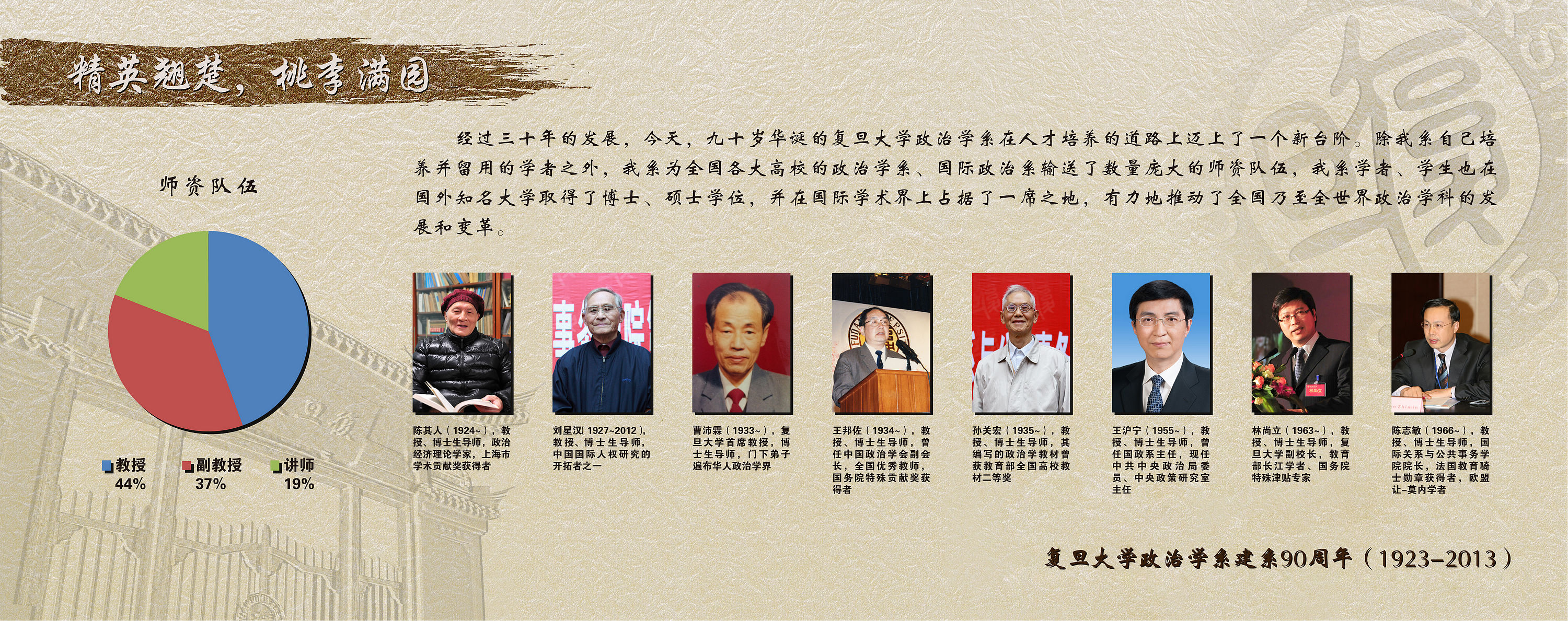 | 高清图下载: 1-07-01.jpg 克勤克俭,勇攀高峰 建系九十年来,秉承前辈先贤严谨治学、传道授业的优良传统和潜心治学的精神,我系已形成一支在全国有重要影响力的老中青三代结构合理的教师队伍,并在国际学术界赢得了良好声誉。老一辈的政治学者给我们奠定了宝贵的基础,中流砥柱的中年教师挑起了向下一个高峰进发的重担,新进的青年学人在学习吸收过往营养的基础上,正为他们心中的学术理想而努力奋斗。 |