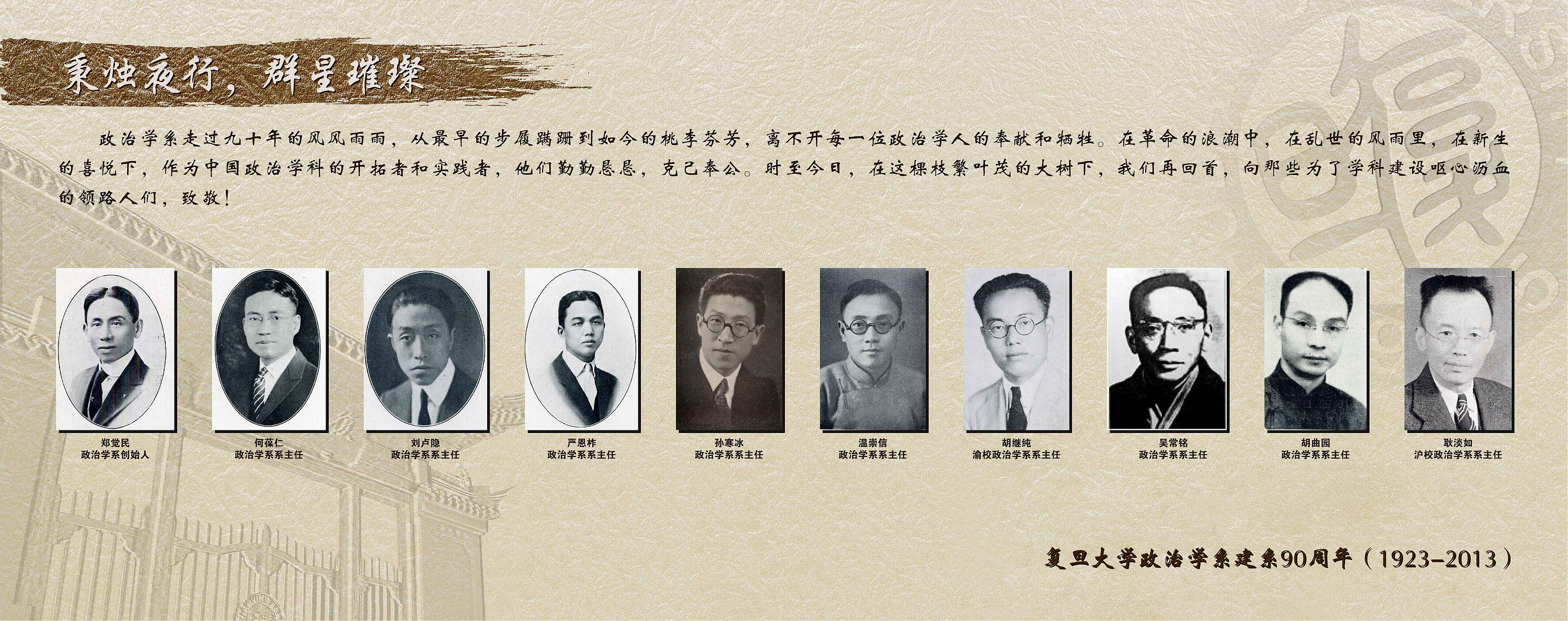 | 高清图下载: 1-03-01.jpg 秉烛夜行,群星璀璨 政治学系走过九十年的风风雨雨,从最早的步履蹒跚到如今的桃李芬芳,离不开每一位政治学人的奉献和牺牲。在革命的浪潮中,在乱世的风雨里,在新生的喜悦下,作为中国政治学科的开拓者和实践者,他们勤勤恳恳,克己奉公。时至今日,在这棵枝繁叶茂的大树下,我们再回首,向那些为了学科建设呕心沥血的领路人们,致敬! |