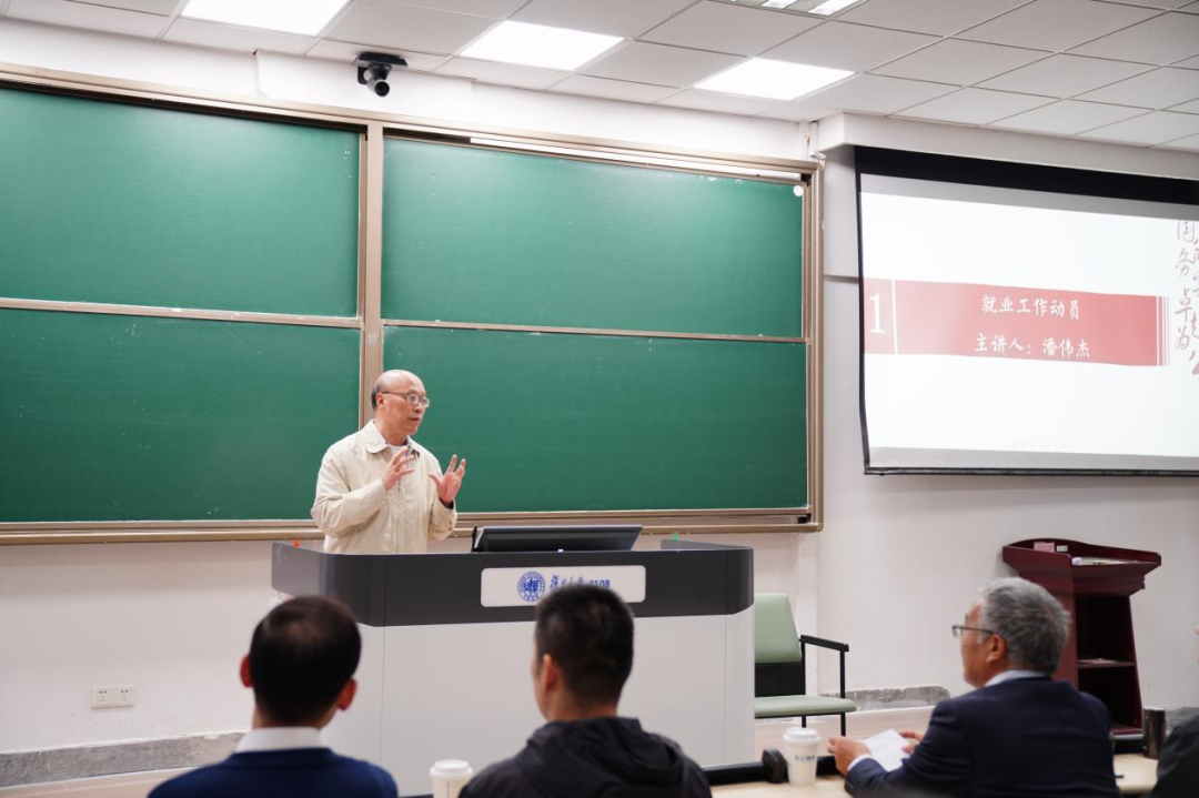 国务学院党委书记潘伟杰老师、院长苏长和老师做就业工作动员。潘书记指出,在职业规划中要坚持“长期主义”,学院深厚的学术底蕴和个人过硬的综合素质是求职之路上的底气所在,同学们应始终将个人职业规划与国家未来发展紧密结合,坚守初心,笃志前行。他寄语学院全体硕士研究生,希望大家在“仰望星空”的同时,也能做到“脚踏实地”,在专业深耕中锤炼过硬本领,在关键节点上保持清醒从容,始终心怀家国天下,在强国建设、民族复兴的伟大征程中勇担使命、挺膺担当。 苏院长强调,打头阵、当尖兵首先要有扎实的基本功,同学们应自觉在党和国家的中心任务中找准个人职业规划的结合点、切入点、着力点,做到无愧于党、无愧于人民、无愧于时代。他勉励同学们在择业过程中应兼顾家国情怀与国际视野,为推动哲学社会科学知识创新、理论创新和方法创新贡献青年力量。
