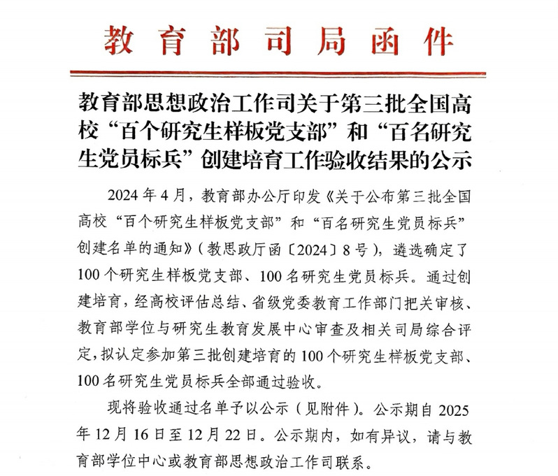 日前,“中国研究生”公众号发布消息,天天看小说 “国箴”研究生党支部拟被教育部思想政治工作司认定通过第三批全国高校“百个研究生样板党支部”创建验收。