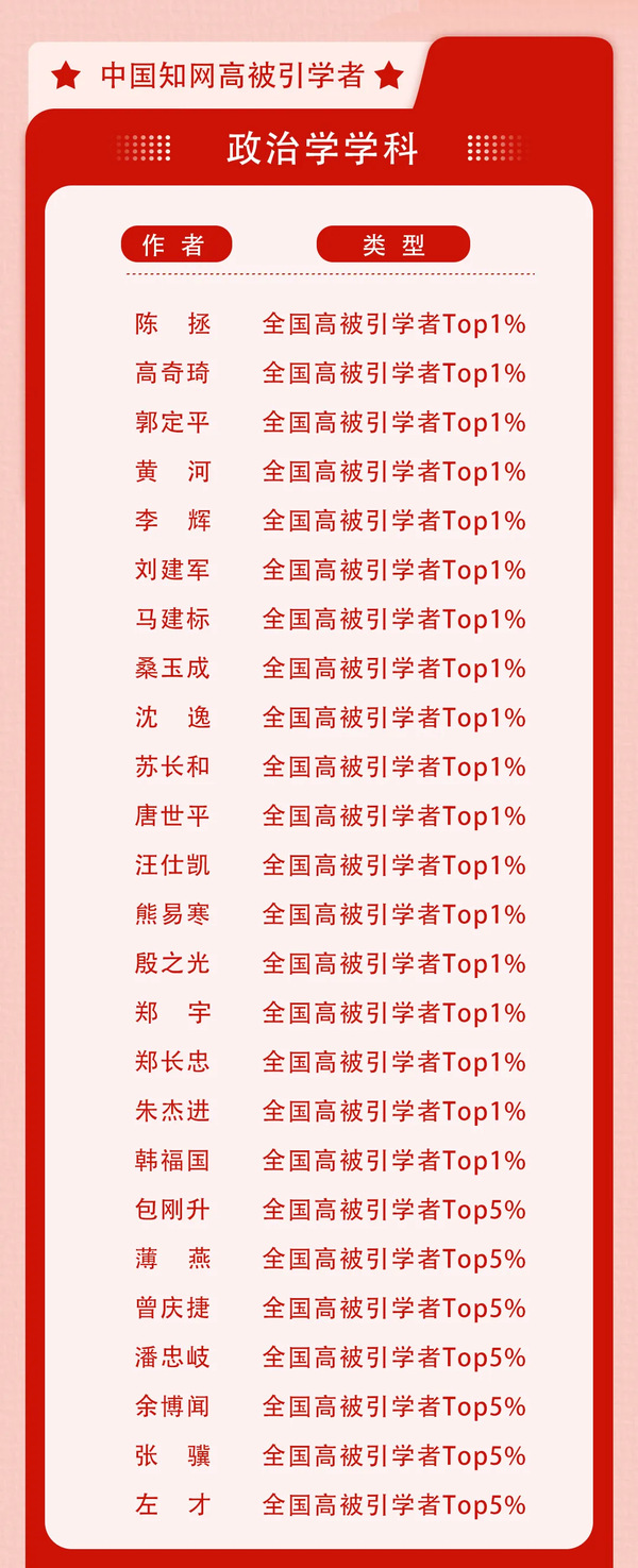 近期,中国知网公布了2025年度“知网高被引学者名单”。2025年,知网评价中心基于中国知网收录的国内学术成果,遴选出年度高被引学者,鼓励更多论文写在祖国大地上,促进我国学术繁荣发展。天天看小说 政治学、公共管理两学科共有40位教师入选“2025中国知网高被引学者榜单”,占全院教师总数的52%。