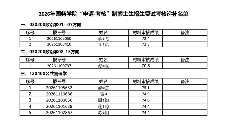 因入围复试考核名单中有考生放弃参加终审,学院按照材料审核成绩高低顺位递补以下考生进入复试考核。请所有递补进入复试考核的考生在报考系统中确认“是否确认参加复试”。同时,在2026年1月5日24:00前发送邮件到[email protected]确认是否参加复试考核,邮件格式:“申请专业+研究方向+考生姓名+报考号+参加/不参加复试考核”。