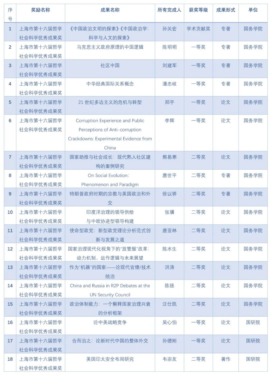 近日,上海市第十六届哲学社会科学优秀成果奖拟获奖名单已公示结束。其中学术贡献奖4人,学术新锐奖14人,党的创新理论研究优秀成果奖50项,学科学术优秀成果奖432项。