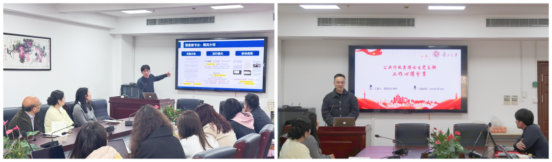 2022级本科生第一党支部书记唐林焕以望道读书会促进班级党建工作为例,从“阶梯式培养”“平台化运作”“全方位融入”三个维度分享了支部党建的模式,并由此提炼出党建工作中的“两个意识”“三个重点”和“三条途径”。公共行政系博士生党支部书记徐圳则基于博士生同学的实际情况,分别从对人的组织、对事的组织、以及对思想的引领这三个层面分享了抓好日常党建工作的办法。